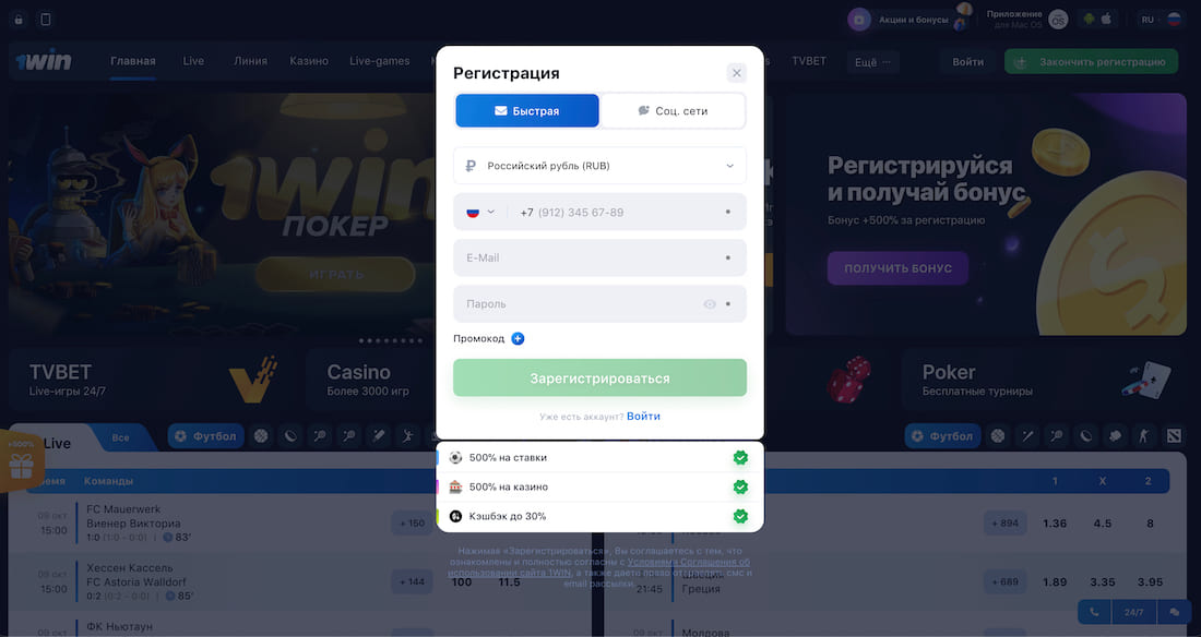 Клиентом 1 Вин может стать любой совершеннолетний пользователь развлечений на деньги, интересующийся азартными играми. Регистрация выполняется по единому алгоритму, независимо от того, планируете ли вы делать ставки в БК на спорт или играть в онлайн казино. Новый аккаунт можно создать, посетив официальный сайт, так и через актуальное зеркало. Важно помнить, что создание нескольких учетных записей одним пользователем запрещено и может повлечь санкции со стороны администрации.